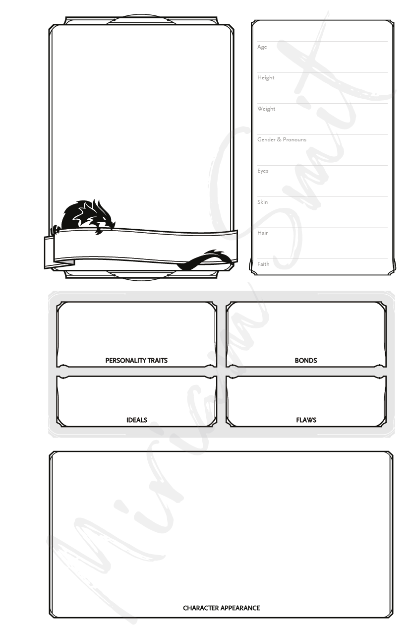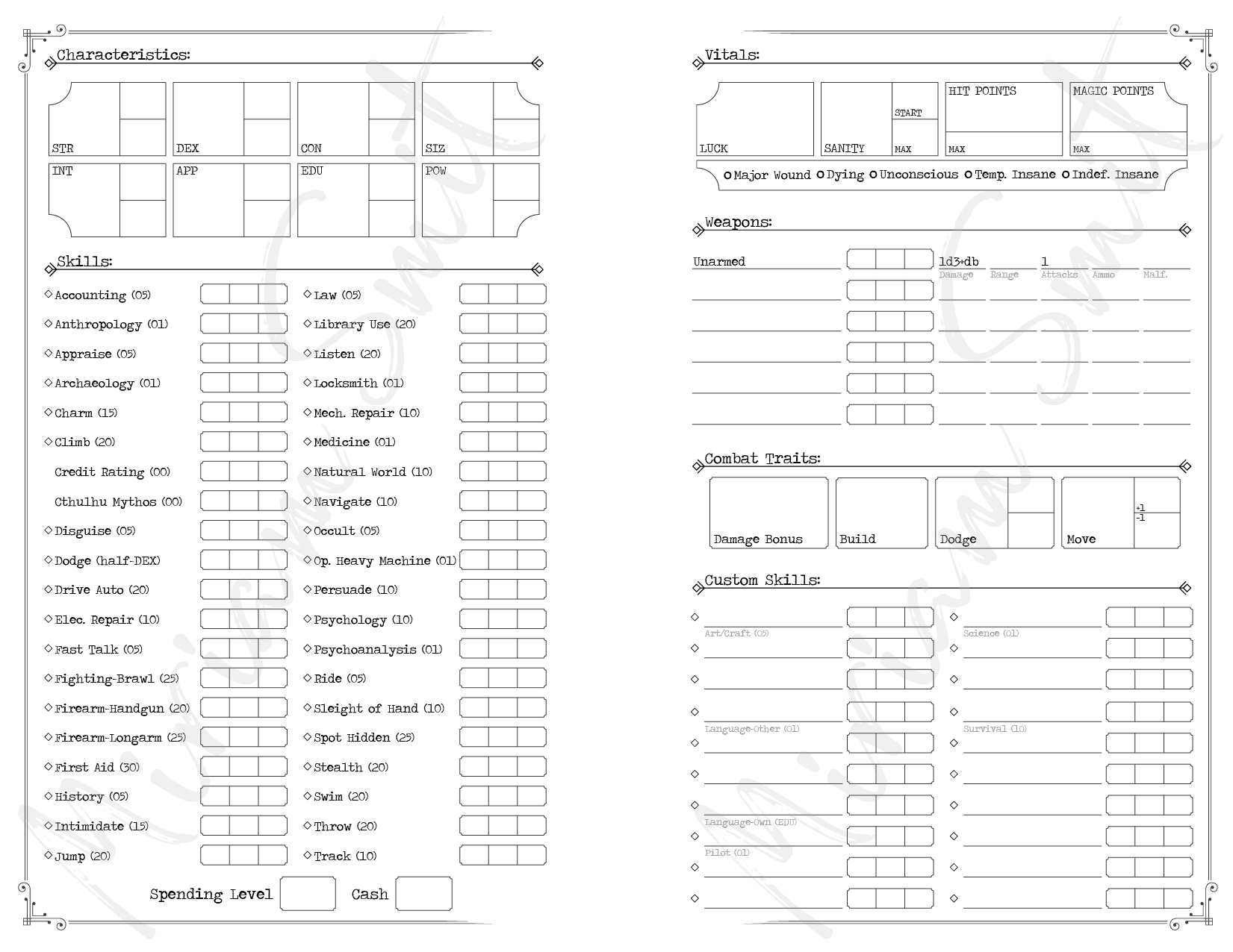 The next challenge I undertook was the character sheet for Call of Cthulhu. In this case the challenge was more than just translating a single page, letter design to an A5, multi page design. It also called for a redesign of the character sheet to improve it's functionality and usability. The fifth edition of Call of Cthulhu had great storytelling element, but the function of the character sheet and handbook left a fair amount to be desired. This involved cleaning up the vitals, custom skills and moving combat traits out of the skills and into its own section.